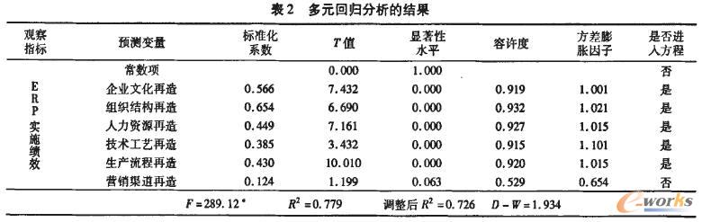 因此,得多元回歸方程如下:ERP實施成功=0.566企業文化再造+0.654組織結構再造+0.449人力資源再造+0.385技術工藝再造+0.430生產流程再造。