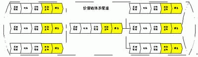 讀者知道,采用縱向一體化的企業(yè),必然會(huì)形成多個(gè)并行的不同的原材料的供應(yīng)過程,這必然引發(fā)向后一體化部分的擴(kuò)充,它會(huì)形成一組提供各類原材料的供應(yīng)機(jī)構(gòu);同樣向前一體化部分的擴(kuò)充,也會(huì)形成多個(gè)不同的銷售機(jī)構(gòu),那么此時(shí)的價(jià)值鏈體系將會(huì)被改造成這樣的體系(見下圖):