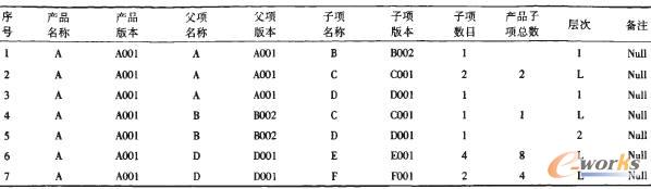 采用復(fù)合式BOM,產(chǎn)品A可用表3來表示。其中,字段“產(chǎn)品子項總數(shù)”表示在產(chǎn)品A中各子件的總數(shù)量,顯然,它只針對產(chǎn)品的最底層零件,對于產(chǎn)品結(jié)構(gòu)樹中的中間部件,則表示為空。