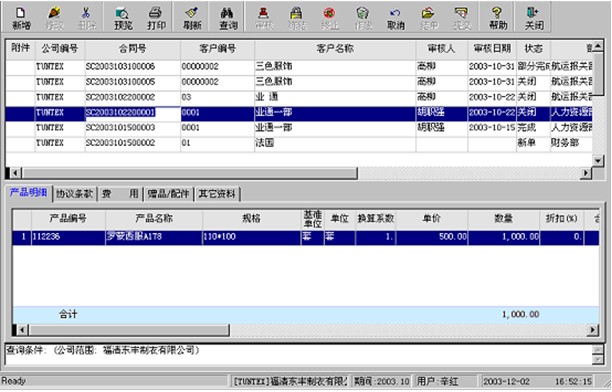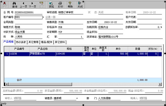 銷售合同錄入記錄企業(yè)與客戶簽定銷售產(chǎn)品的詳細資料,包括產(chǎn)品明細,協(xié)議條款,贈品\配件和其它資料等。銷售合同管理對銷售合同進行審核、反審、修改、刪除等操作。