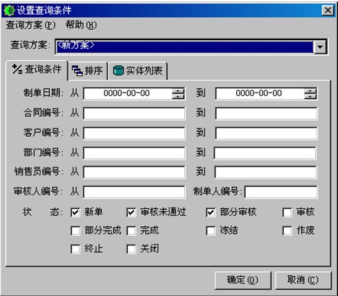 查詢方式有三種:定位、自定義查詢、查詢。查詢接口如下圖所示,接口上列有查詢條件:制單日期、客戶、部門、單據(jù)狀態(tài)。可對接口上的條件進行任意組合,具體設定請參見《公共操作手冊》。